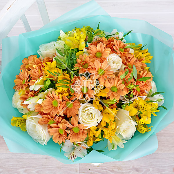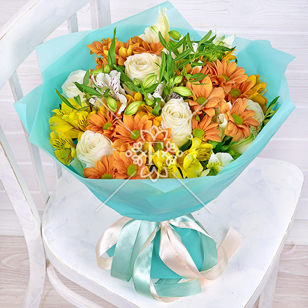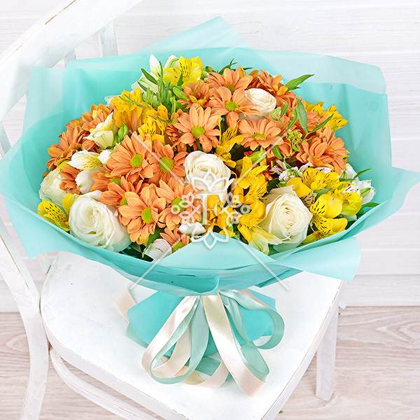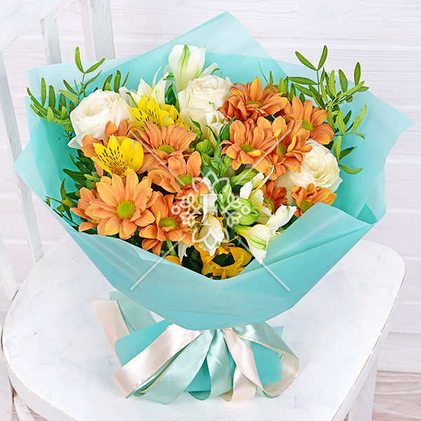 роза белая – 3 шт., хризантема оранжевая кустовая – 2 шт., альстромерия желтая, оранжевая, белая – 4 шт., зелень декоративная (фисташка), упаковка, лента.