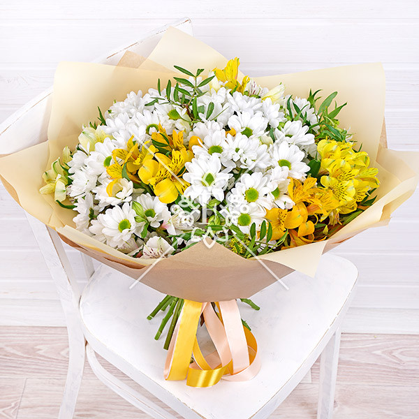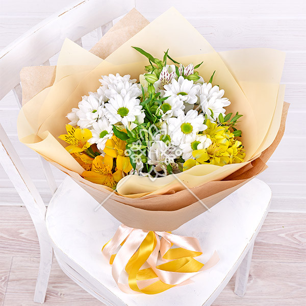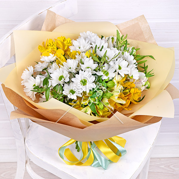 хризантема белая – 2 шт., альстромерия белая, желтая – 5 шт., зелень декоративная (фисташка), упаковка, лента.