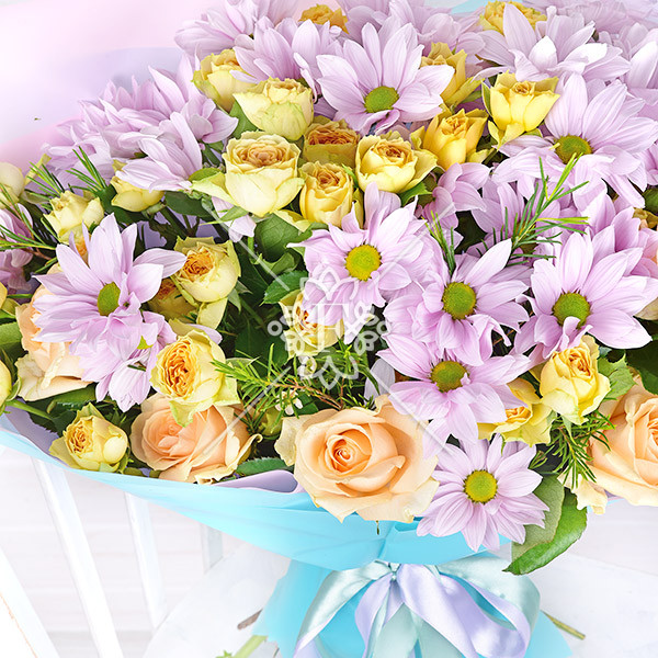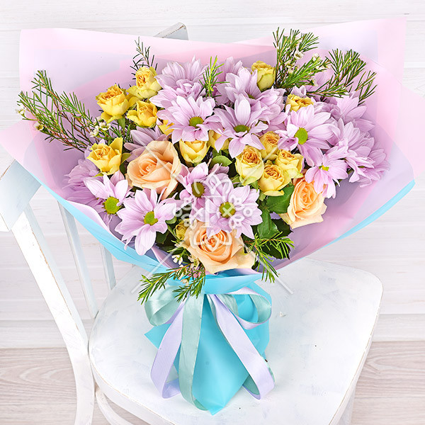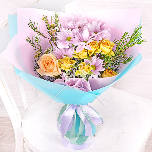 Роза кремовая (персиковая)-1шт, роза желтая кустовая –1шт., хризантема кустовая светло-сиреневая-1шт., хамелациум- 1шт., упаковка, лента.