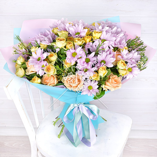 Цветочная поляна – букет-новинка из роз, хризантем с декоративной зеленью