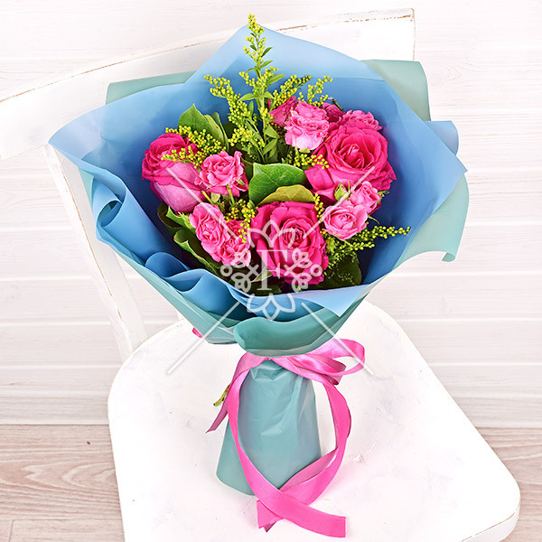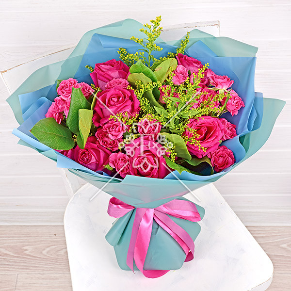 роза малиновая  – 3 шт., роза малиновая кустовая –2 шт., зелень декоративная (солидаго, салал), упаковка, лента.