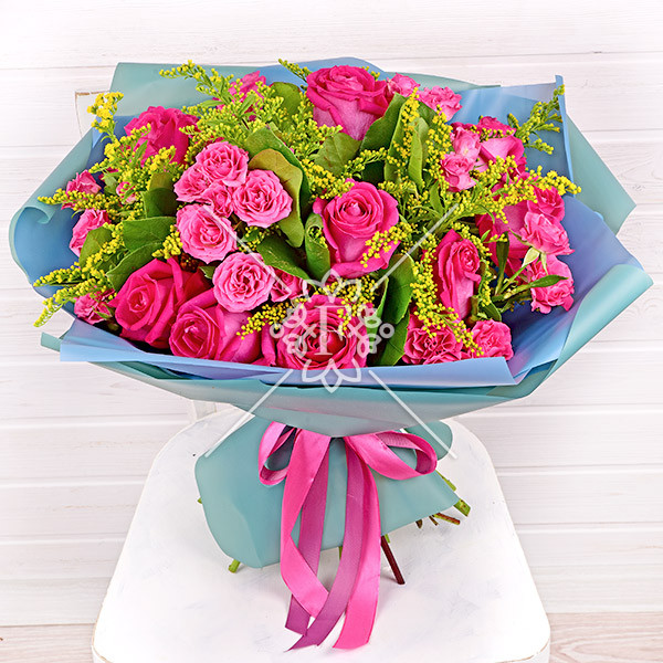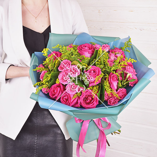 Кустовые и одноголовые малиновые розы, в обрамлении золотого солидаго и нежной зелени салала, восхитительны!  В этой цветочной композиции малиновая роза - символ учтивости, вежливости и изысканности, выглядит насыщенно, ярко, привлекательно и стильно.